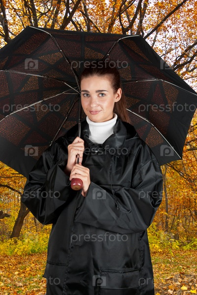 Молодая симпатичная девушка с зонтом в осеннем парке