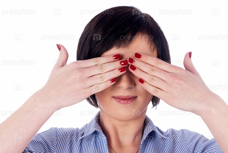 Женщина закрывает глаза на белом фоне
