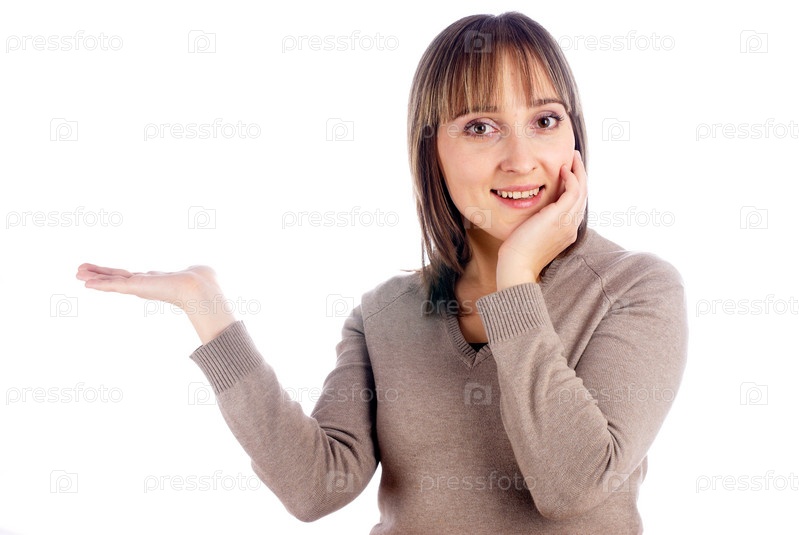 Портрет молодой женщины с выставленной рукой на белом фоне