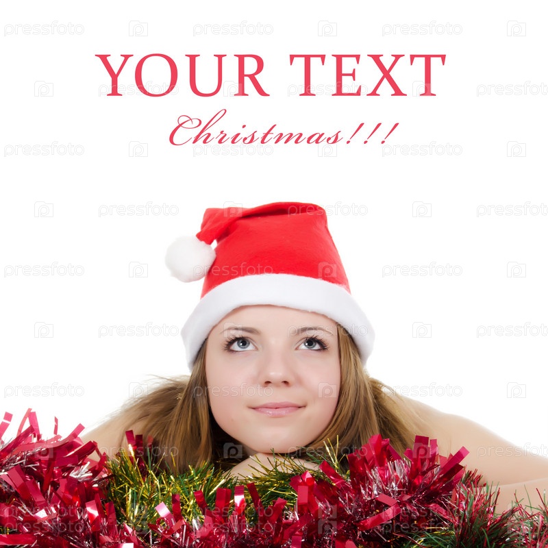 Молодая симпатичная женщина в новогоднем колпаке на белом фоне