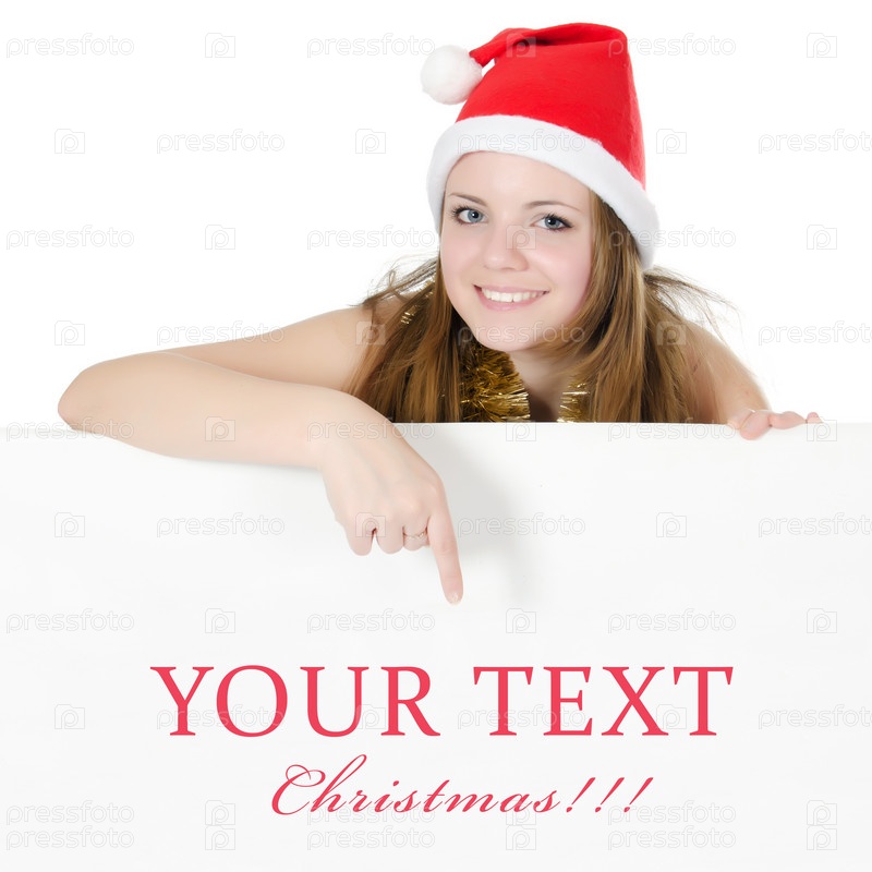 Молодая симпатичная женщина в новогоднем колпаке на белом фоне