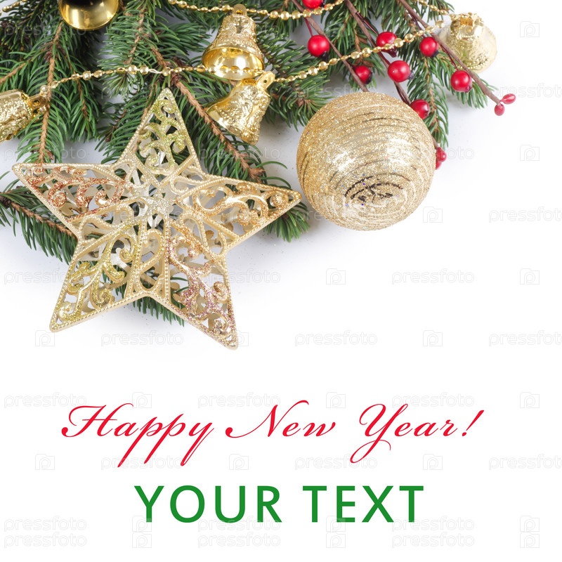 Елка и новогодние украшения на белом фоне