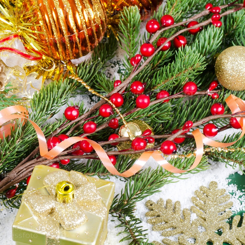 Еловые ветки и новогодние украшения