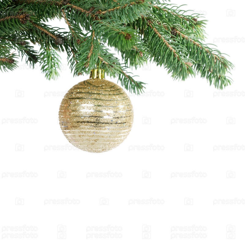 Еловые ветки и новогодние украшения на белом фоне