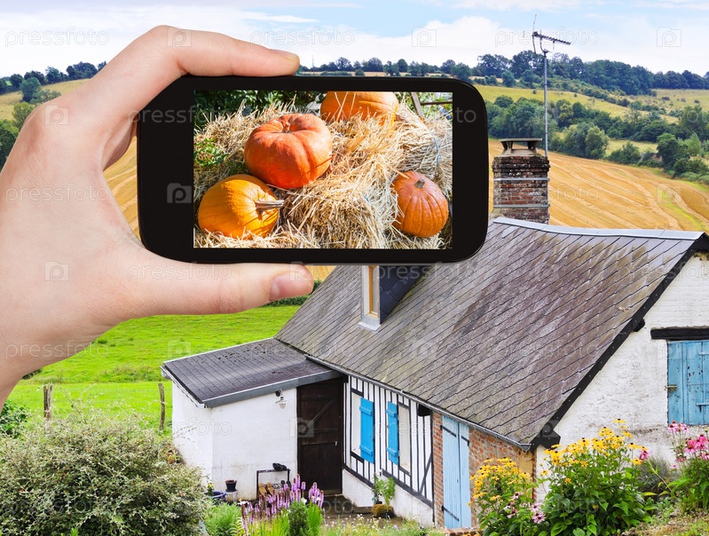 Спелые тыквы на соломе в смартфоне
