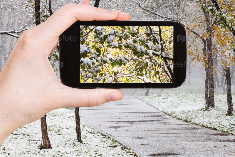 Хлопья первого снега на деревьях