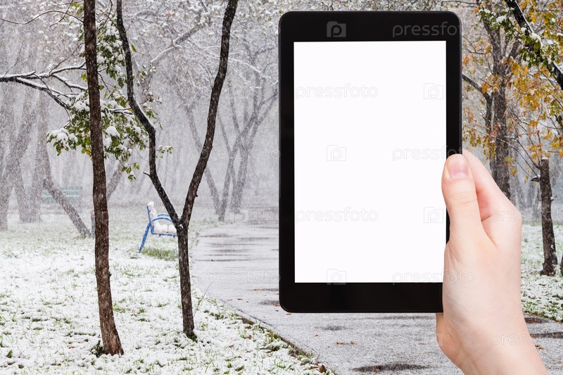 Планшет и первый снегопад в городском парке