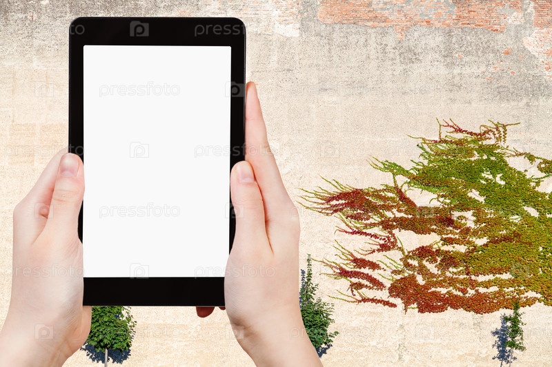 Планшет белый экран на фоне стены