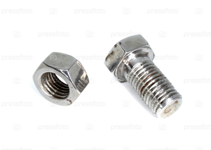 Болт и гайка крупным планом на белом фоне