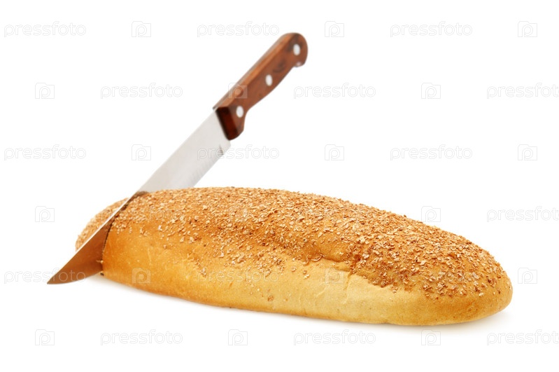 Свежий хлеб и кухонный нож, изолированные на белом фоне