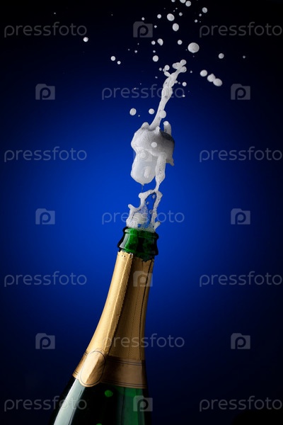 Открытая бутылка шампанского на синем фоне