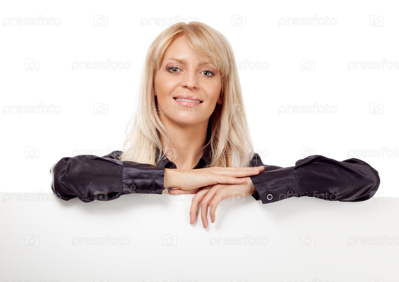 Молодая женщина с пустым плакатом на белом фоне