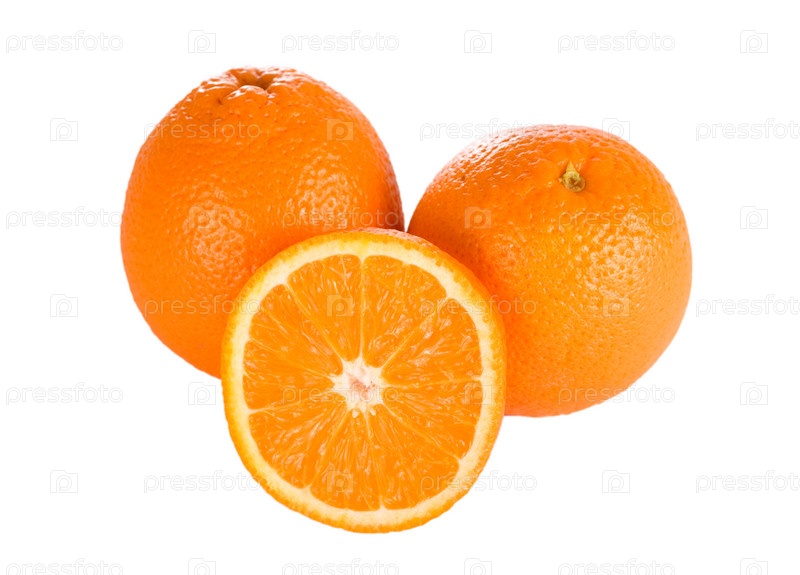 Два целых апельсина и половинка апельсина на белом фоне