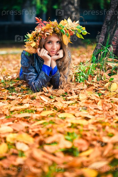 Девушка лежит под деревом в венке из листьев