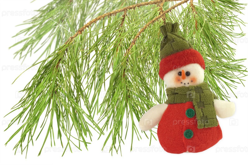 Снеговик на еловой ветке на белом фоне