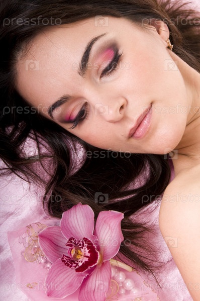 Девушка с ярким макияжем смотрит на цветок орхидеи