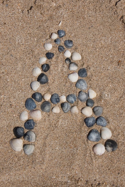 Буква А из ракушек на песке летом