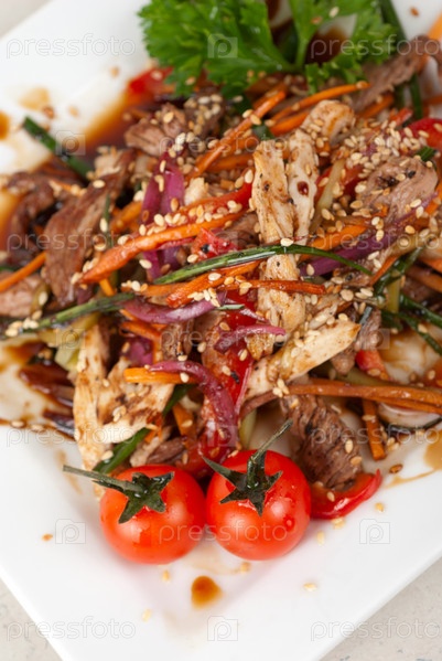 Вкусная закуска из жареной говядины, помидорами черри и другими овощами