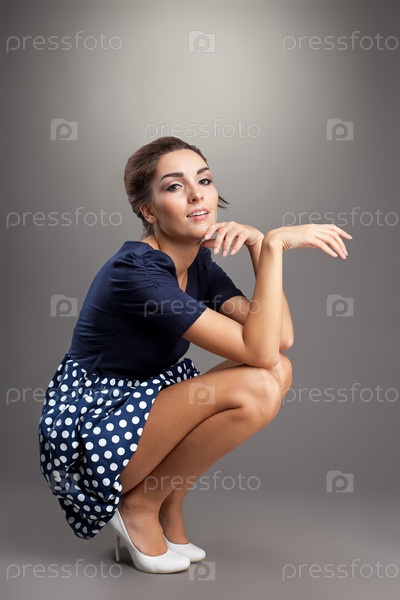 Красивая молодая женщина в платье ретро на сером фоне