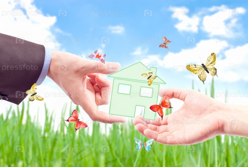 Дом в руках на фоне голубого неба, как символ операции с недвижимостью