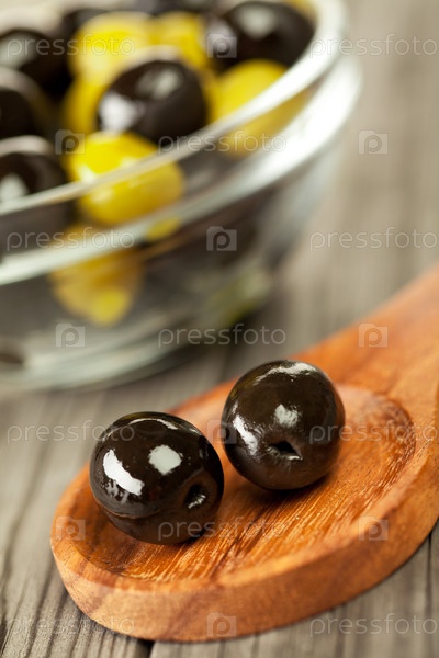 Оливки в миске на деревянном столе