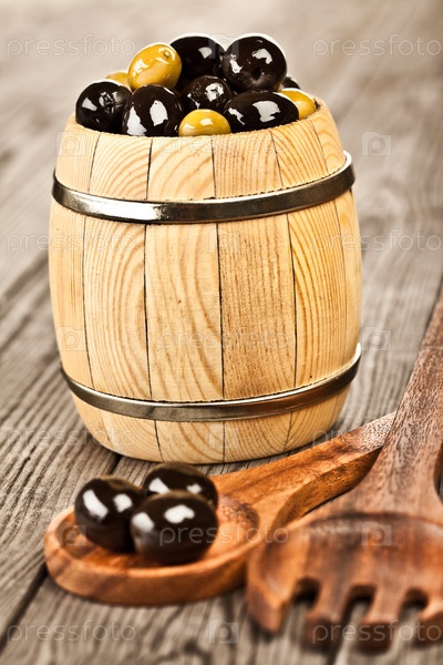 Оливки в бочонке на деревянном столе