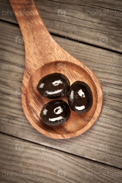Оливки в ложке на деревянном столе