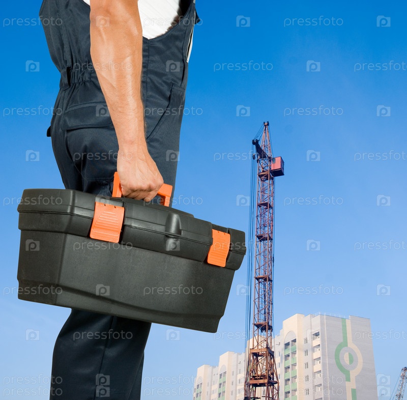 Строитель с ящиком для инструментов на фоне строящегося дома