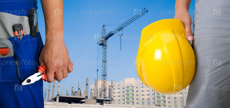 Строители с инструментами и каской на фоне строящегося дома