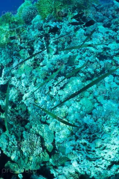 Банды игловых рыбок на фоне кораллового рифа .Дикая природа Красного моря, Египет