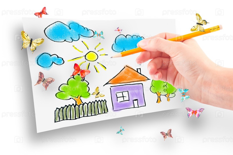 Человеческая рука с карандашом рисует дом мечты на белом листе бумаги