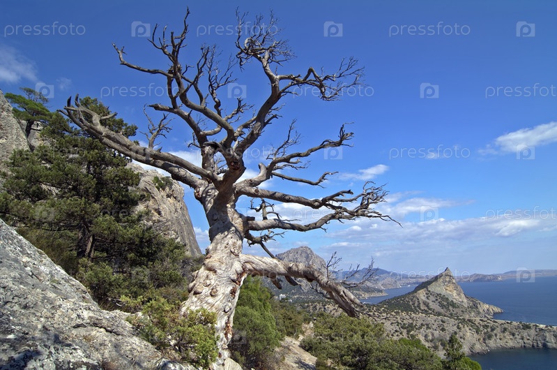 Мертвая сосна на скале на фоне Черного моря, Крым