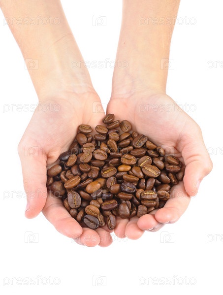 Кофейные зерна в ладонях. На белом фоне
