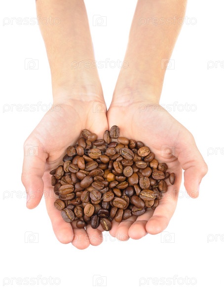Кофейные зерна в ладонях. На белом фоне