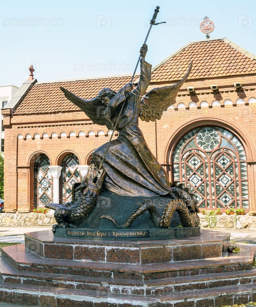 Скульптура "Архангел Михаил пронзает копьем змея" на фоне костела Святых Симеона и Елены, Минск, Беларусь