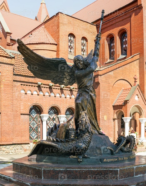 Скульптура "Архангел Михаил пронзает копьем змея" на фоне костела Святых Симеона и Елены, Минск, Беларусь