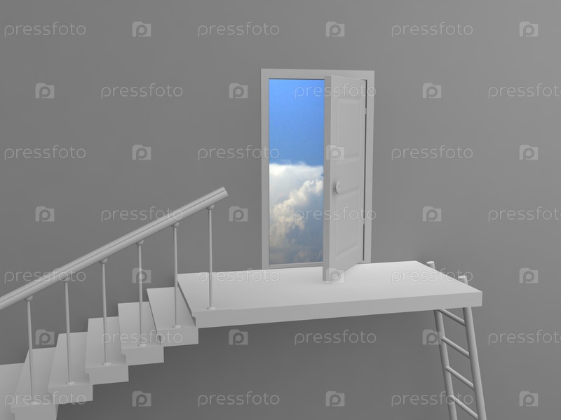 Виртуальная трехмерная лестница и дверь в небо на сером фоне