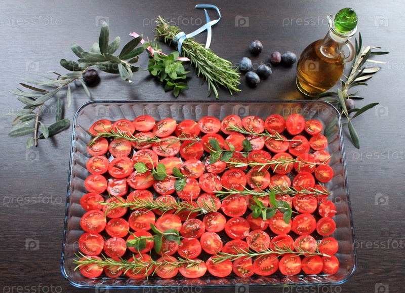 Томаты, приготовленные рывок специй и оливковое масло, средиземноморская кухня
