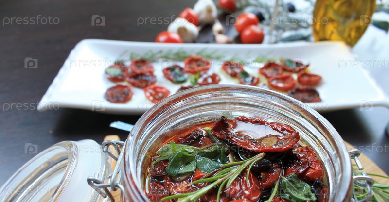 Вяленые помидоры черри с приправами в оливковом масле в стеклянной банке, средиземноморская кухня