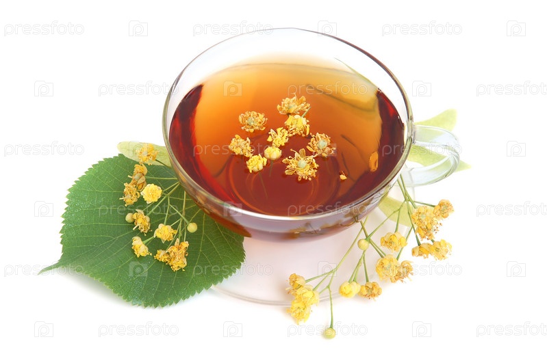 Липовый чай со свежими цветами липы на белом фоне