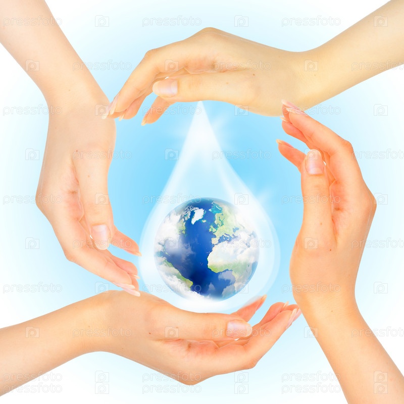 Капля воды с Землей внутри и руки на белом фоне. Символ сохранения планеты