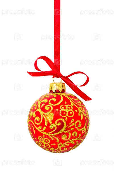 Красный елочный шар на белом фоне
