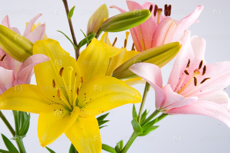 Розовые и желтые лилии на белом фоне
