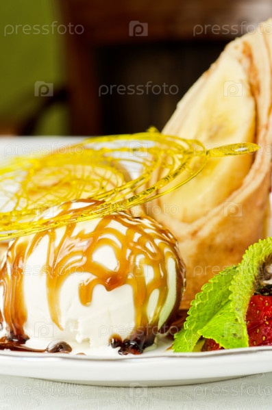 Блины с бананом, мороженым, карамелью, клубникой и мятой