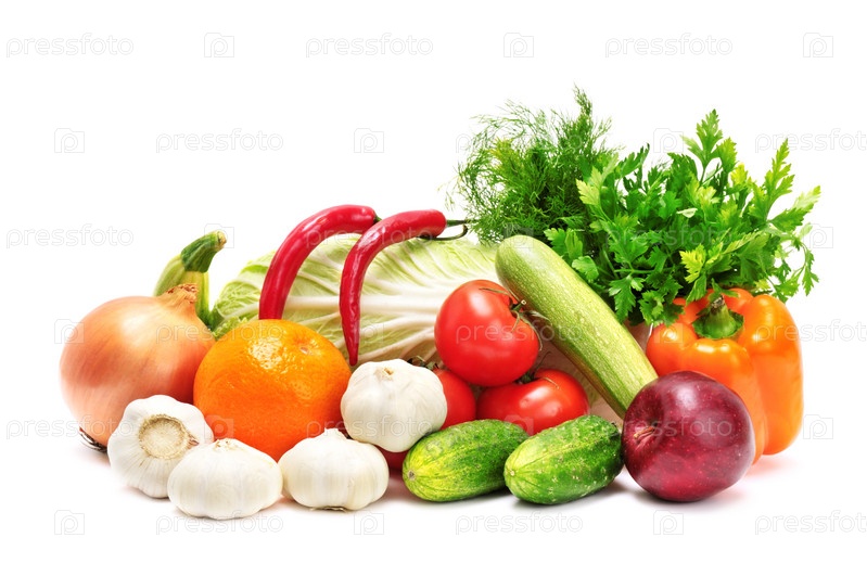 Фрукты и овощи на белом фоне