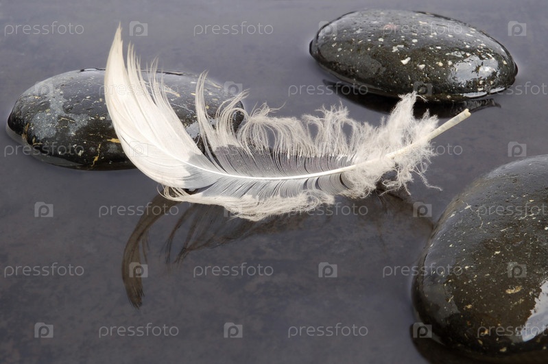Белое перо и плоские камни на темном фоне воды