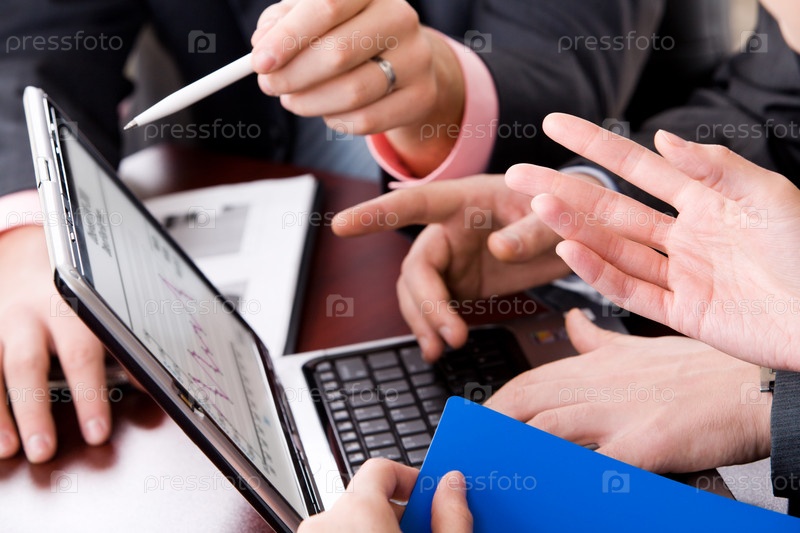 Фото человеческих рук, указывающих на монитор ноутбука