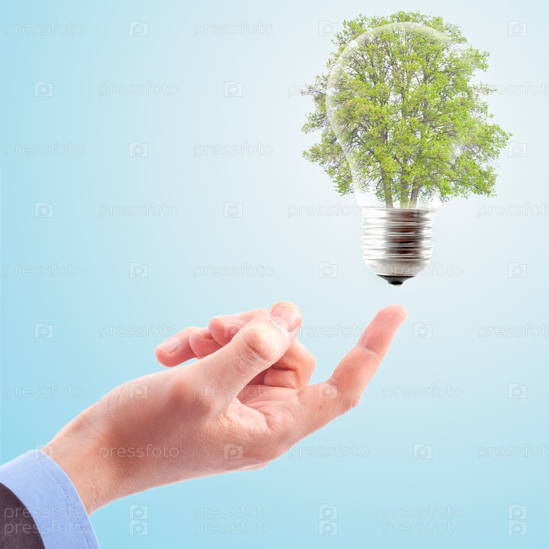 Рука с лампой и деревом. Концепция использования возобновляемых источников энергии