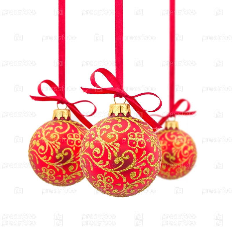Три красных рождественских шара висят на лентах