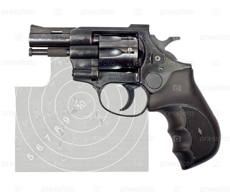 Черный револьвер и мишень на белом фоне